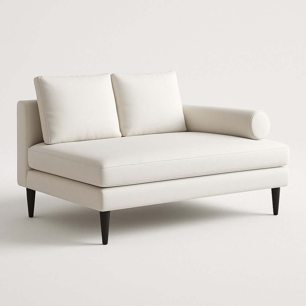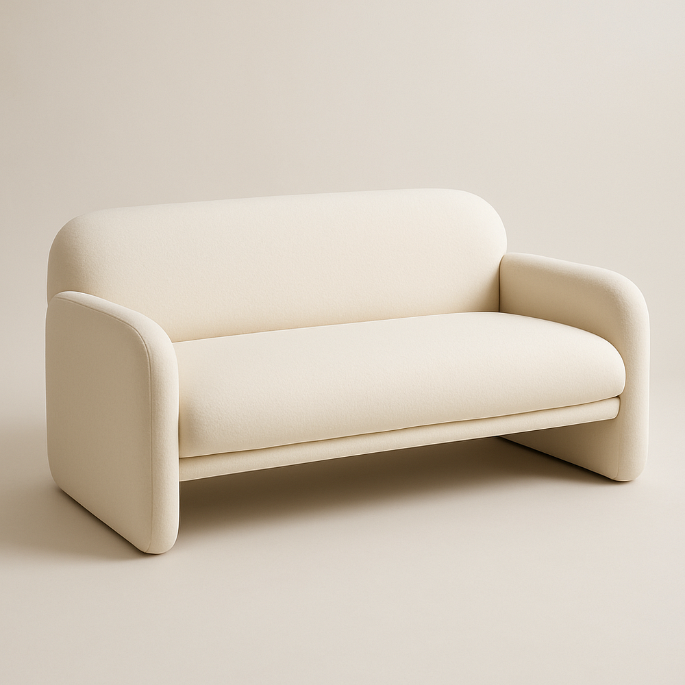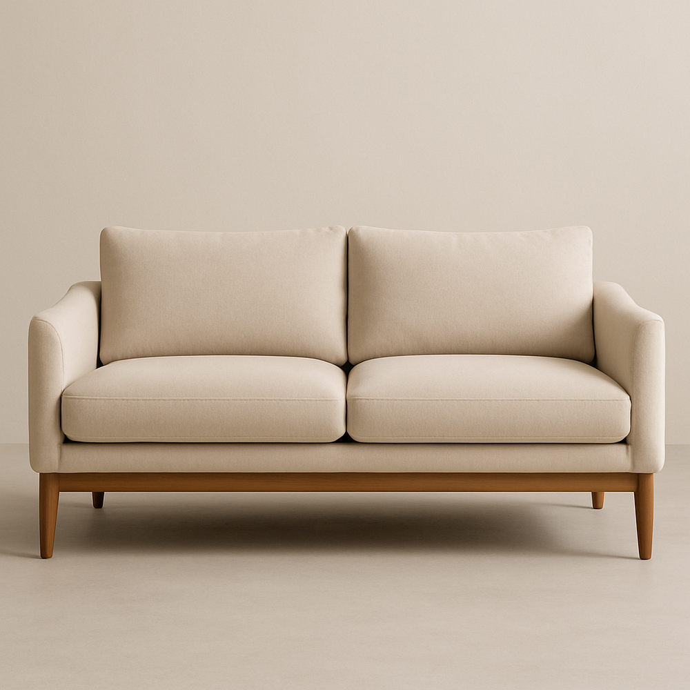 Canapé deux places tissu rembourré beige structure bois rectangulaire
