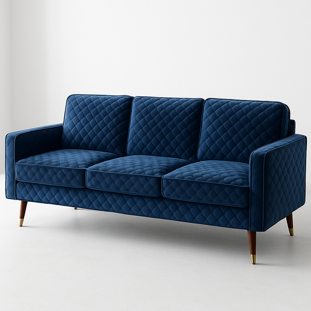 Canapé trois places velours bleu matelassé pieds en bois