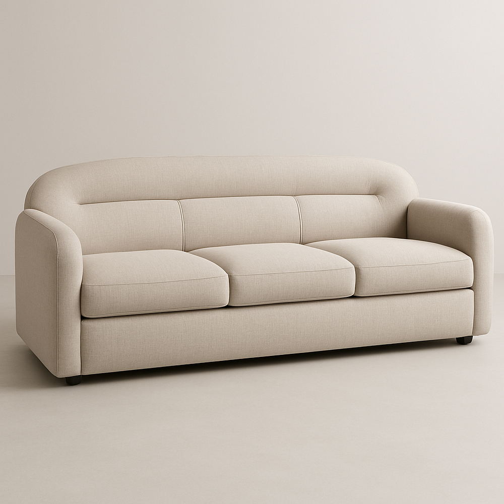 Canapé trois places tissu beige accoudoirs courbés rembourré confortable