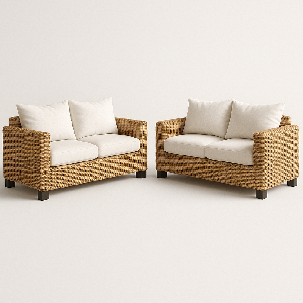 Canapé 2 places ensemble en rotin beige coussins crème