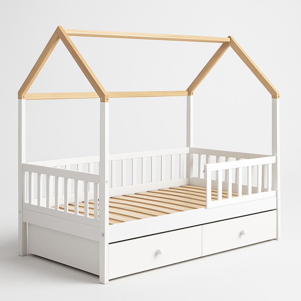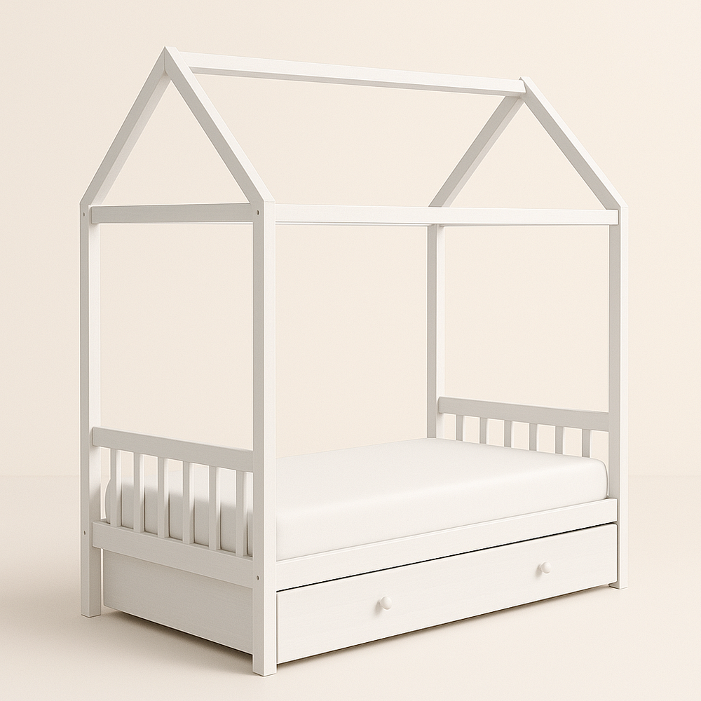Lit cabane enfant bois blanc rectangle cadre bois matelas 90x200 avec tiroir