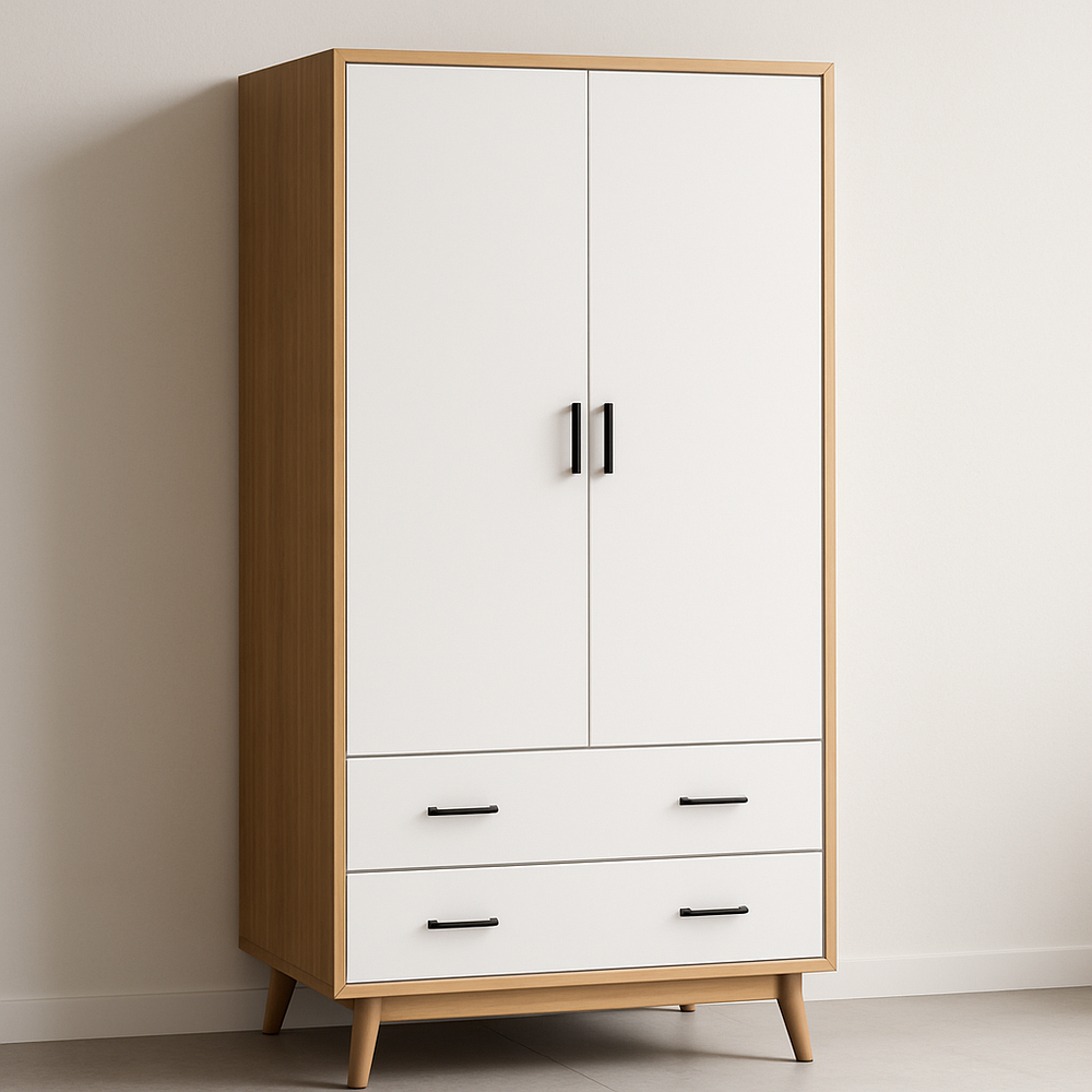Armoire en Bois Panneau MDF 180x90x50 cm avec 2 Portes 2 Tiroirs Design Moderne Blanc/Chêne
